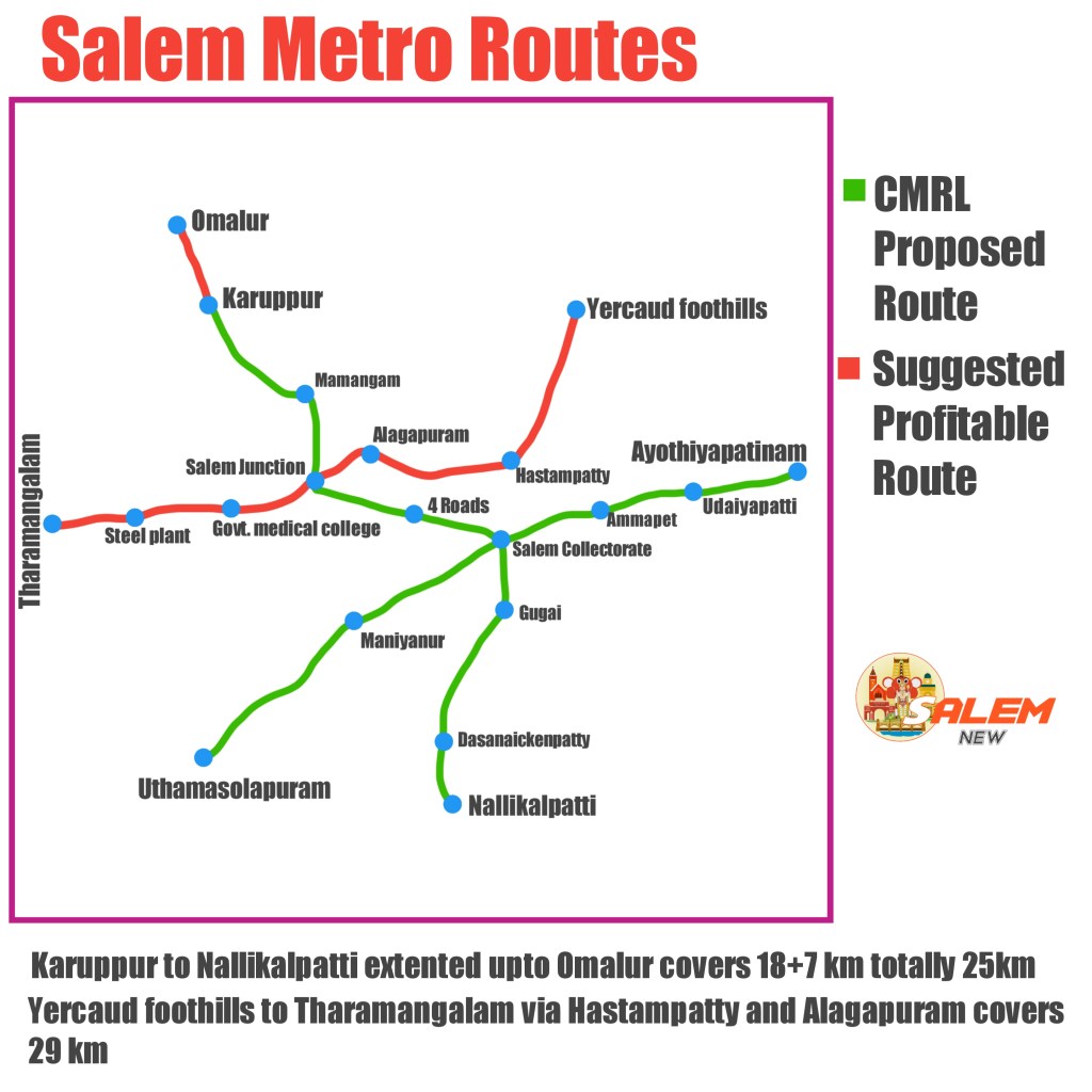 In Salem – Banglore direction they suggested route only upto Karuppur, and they missed Omalur which is major Suburban area of Salem. Periyar University and Goverment Engineering College can give High ridership for metro, atleast 5000-10,000 ridership will recorded in these 2 institutes. Many peoples used to visit Salem from Omalur daily.